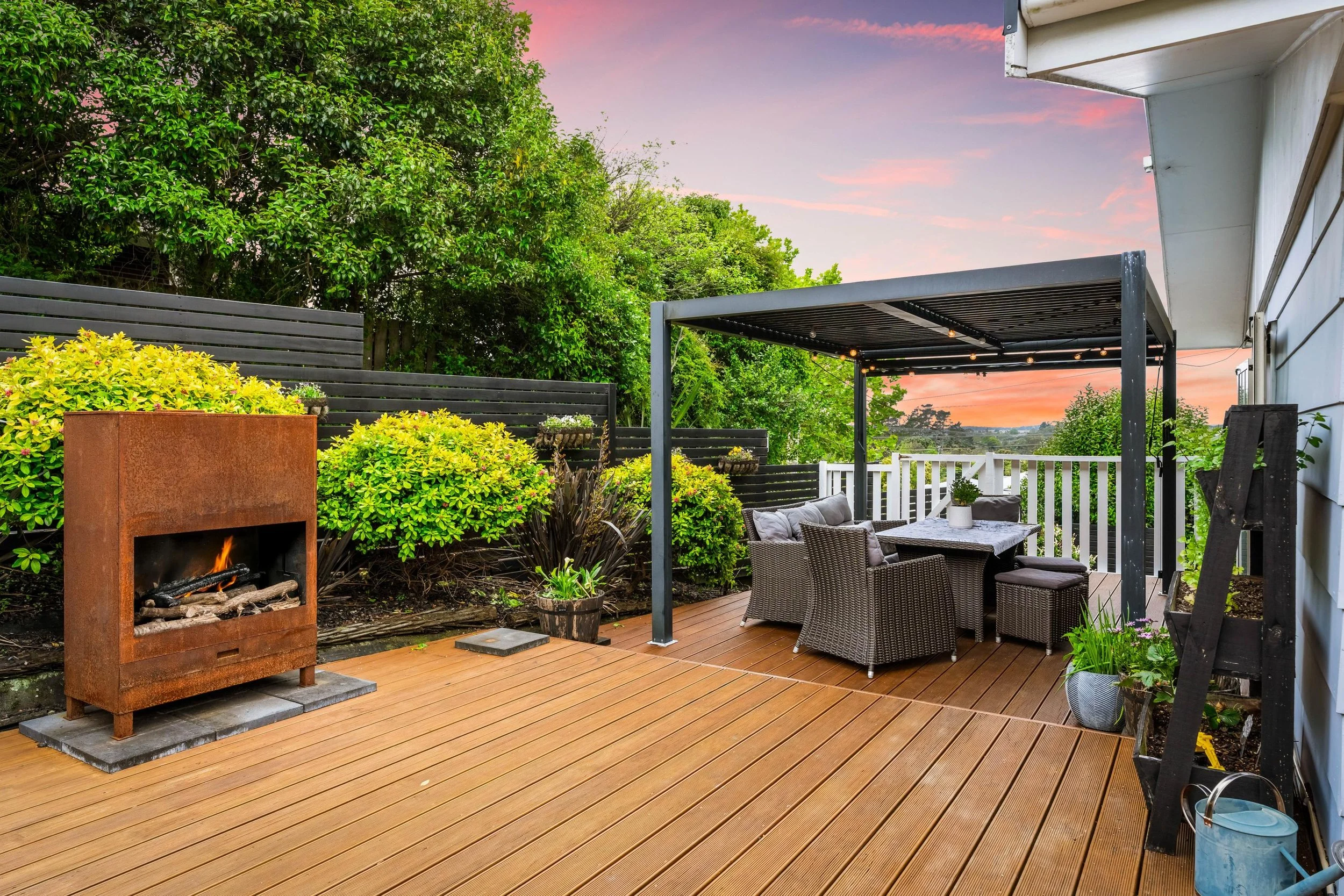 Private lawn and patio, outdoor fireplace on a fully fenced landscaped setting with mature hedges