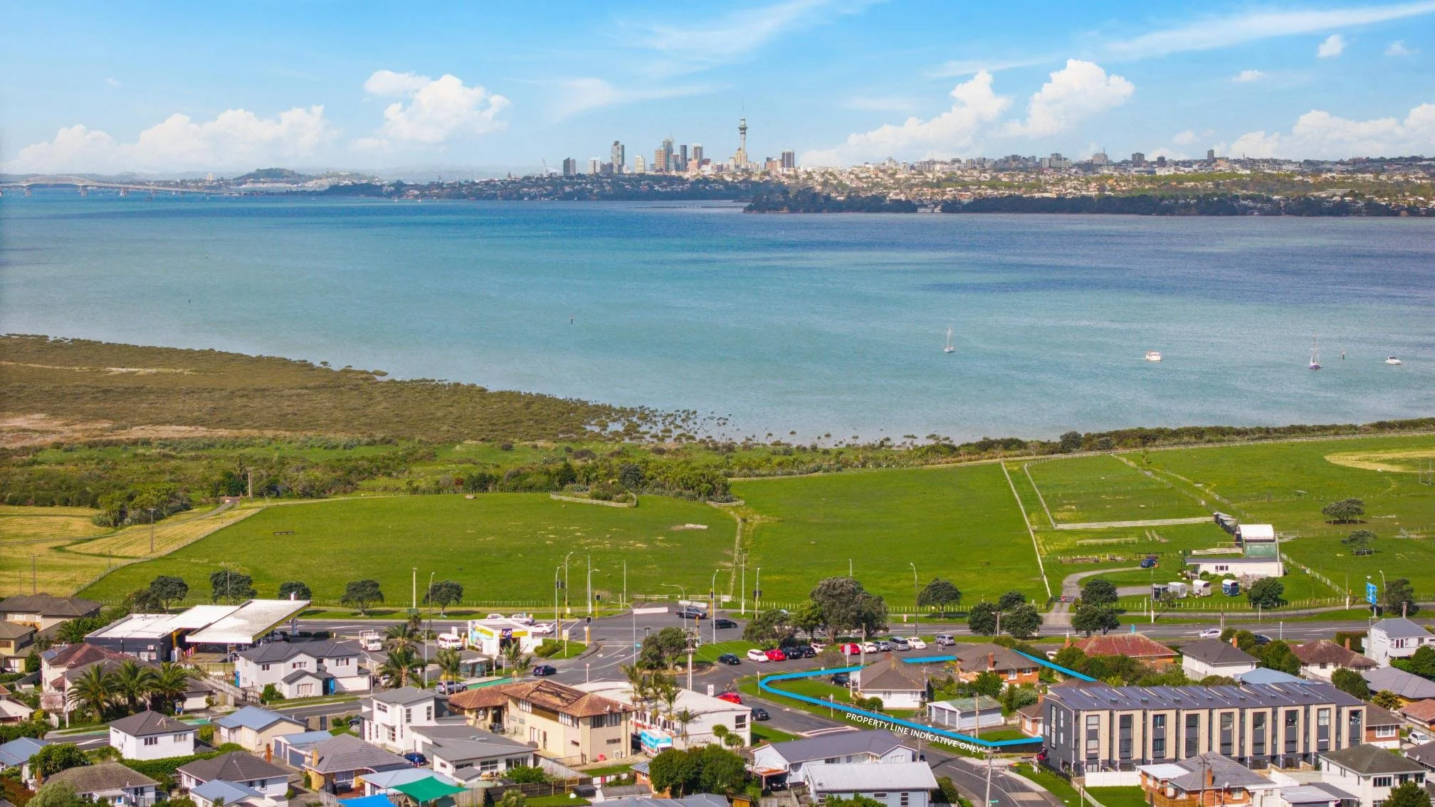 The site is elevated above Te Atatū Road with wide views across Orangihina Park, Rangitoto Island, and the Auckland CBD skyline. The contour and dual access points provide development flexibility and efficient layout potential.